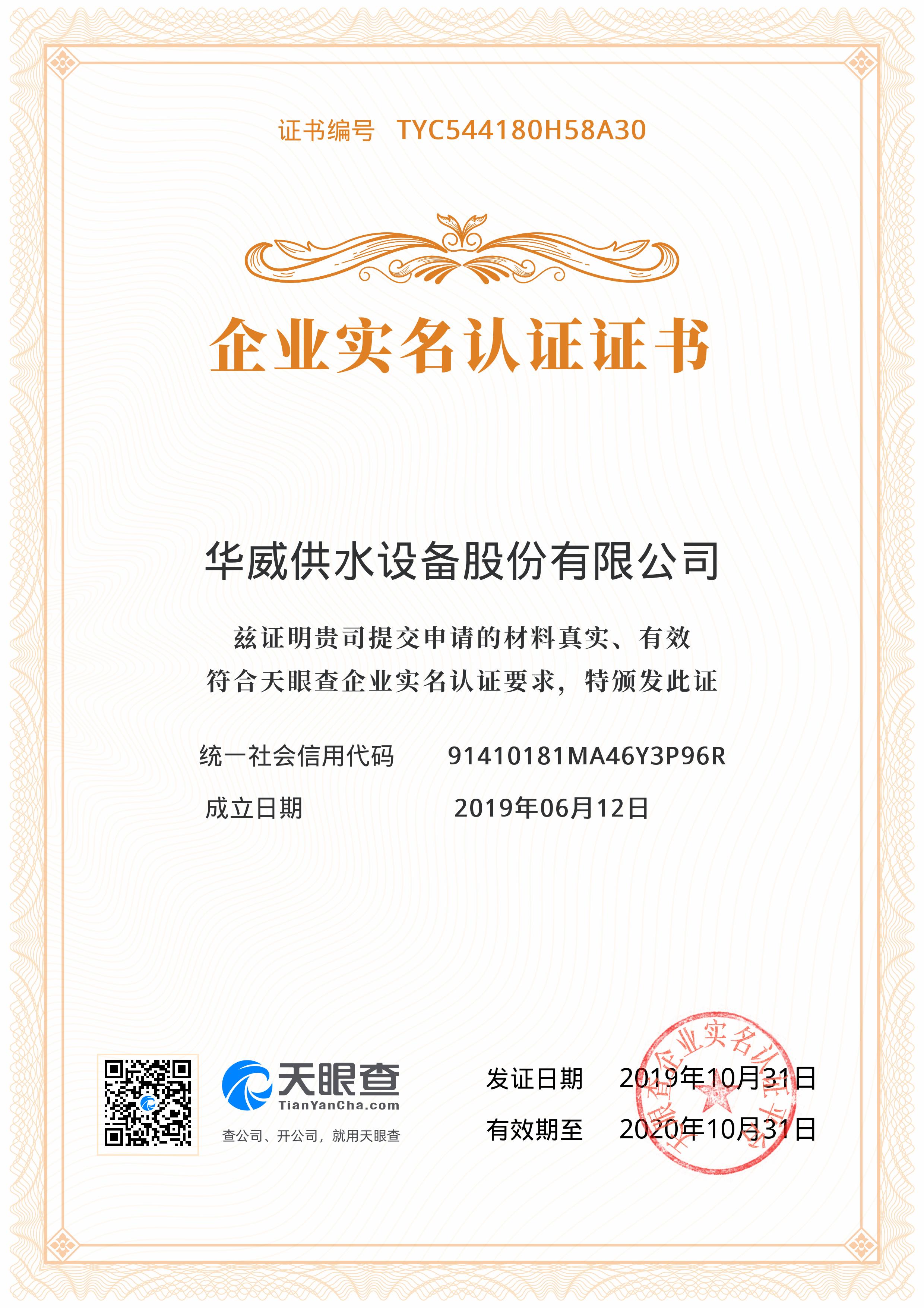 華威供水設(shè)備股份有限公司 證書編號(hào) TYC544180H58A30 法定代表人 吳金偉 注冊(cè)資本 5188萬元人民幣 成立日期 2019-06-12 營(yíng)業(yè)期限 2019-06-12至無固定期限 企業(yè)類型 其他股份有限公司(非上市) 登記機(jī)關(guān) 鞏義市市場(chǎng)監(jiān)督管理局 頒發(fā)日期2019-10-31  |