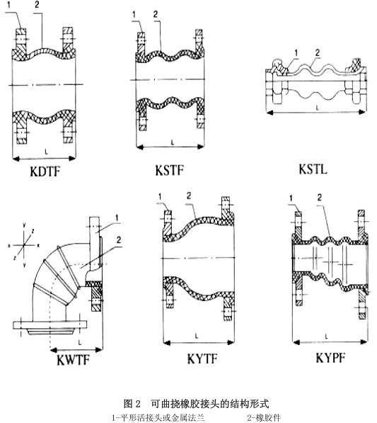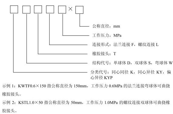 可曲撓橡膠接頭命名和型號由可曲撓橡膠接頭的分類、結(jié)構(gòu)形式、連接形式、通用名稱、工作壓力、公稱直徑組成。用漢語拼音字母和阿拉伯?dāng)?shù)字表示。